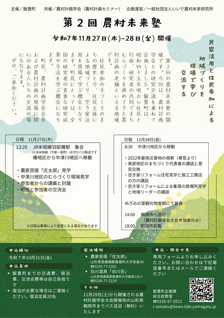 第2回の農村未来塾の開催です。今回は、農村計画学会との研究交流を兼ねて企画しました。飯豊町は、昭和45年頃から住民と行政、研究者の共同でまちむらづくりを進めてきた農村計画の老舗といえる地域です。