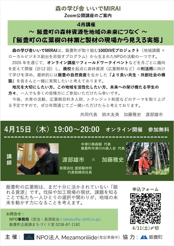 町に広がる山林や森林資源の今を知って、これからの暮らしや地域の未来を考える公開講座を開催します。第4回は、飯豊町の広葉樹の林業と製材の現場から見える実態について学びます。講座は無料でどなたでも参加できます。
